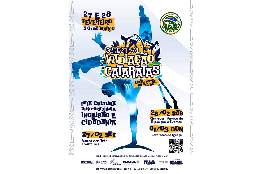 O Festival Vadiação Cataratas 2026 – União entre os Povos chega à sua terceira edição e promete transformar Foz do Iguaçu em palco de cultura, tradição e resistência. Entre os dias 27 e 28 de fevereiro e 1º de março, a cidade recebe três dias de intensa programação com rodas de capoeira, oficinas culturais, apresentações artísticas, ciclo de palestras e Encontro de Mestres.